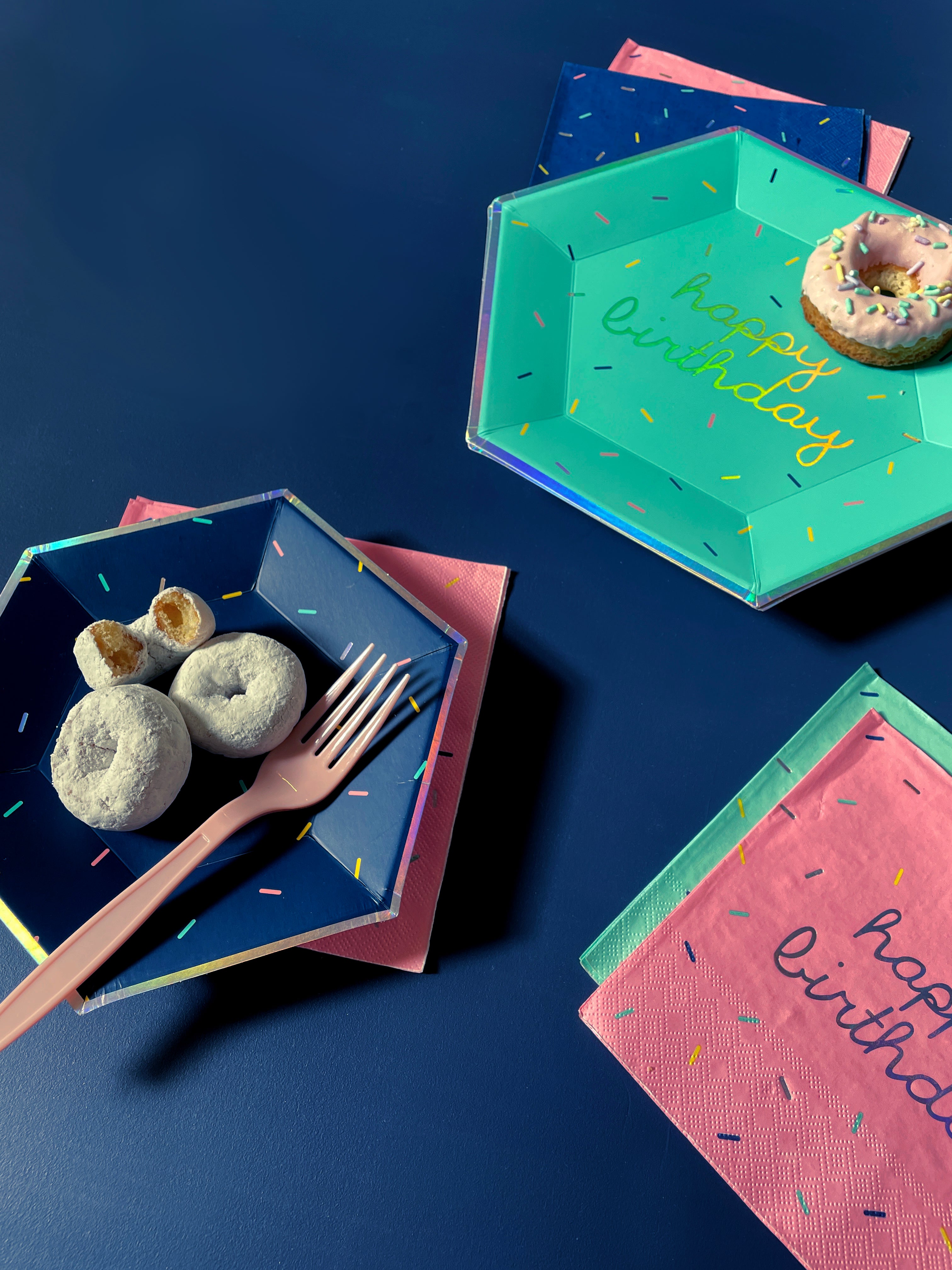 Make your birthday party dreams come true! Designed with shiny iridescent holographic foil details and fun colors, our bright partyware kit will have every kid and adult feeling sprinkled with love!
