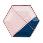 A modern, graceful color palette inset with fine rose gold trim, elevate your party with our colorblock hexagon party plates. Perfect for bridal showers, special birthdays, or gender reveal parties!