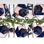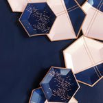 Beautiful layers of painterly strokes with rose gold foil details, elevate your party with our abstract hexagon party plates. Serve up starters or dessert in the perfect handheld size plate for bridal showers, special birthdays, or gender reveal parties!