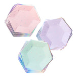Shimmering in fun holographic rim, our pastel ombre small hexagon paper plates set a joyful tone for your next birthday celebration whether it be unicorn, ice cream, donut, or cupcake themed! Complete with a sweet quote on the back of the plate to make your party extra special!