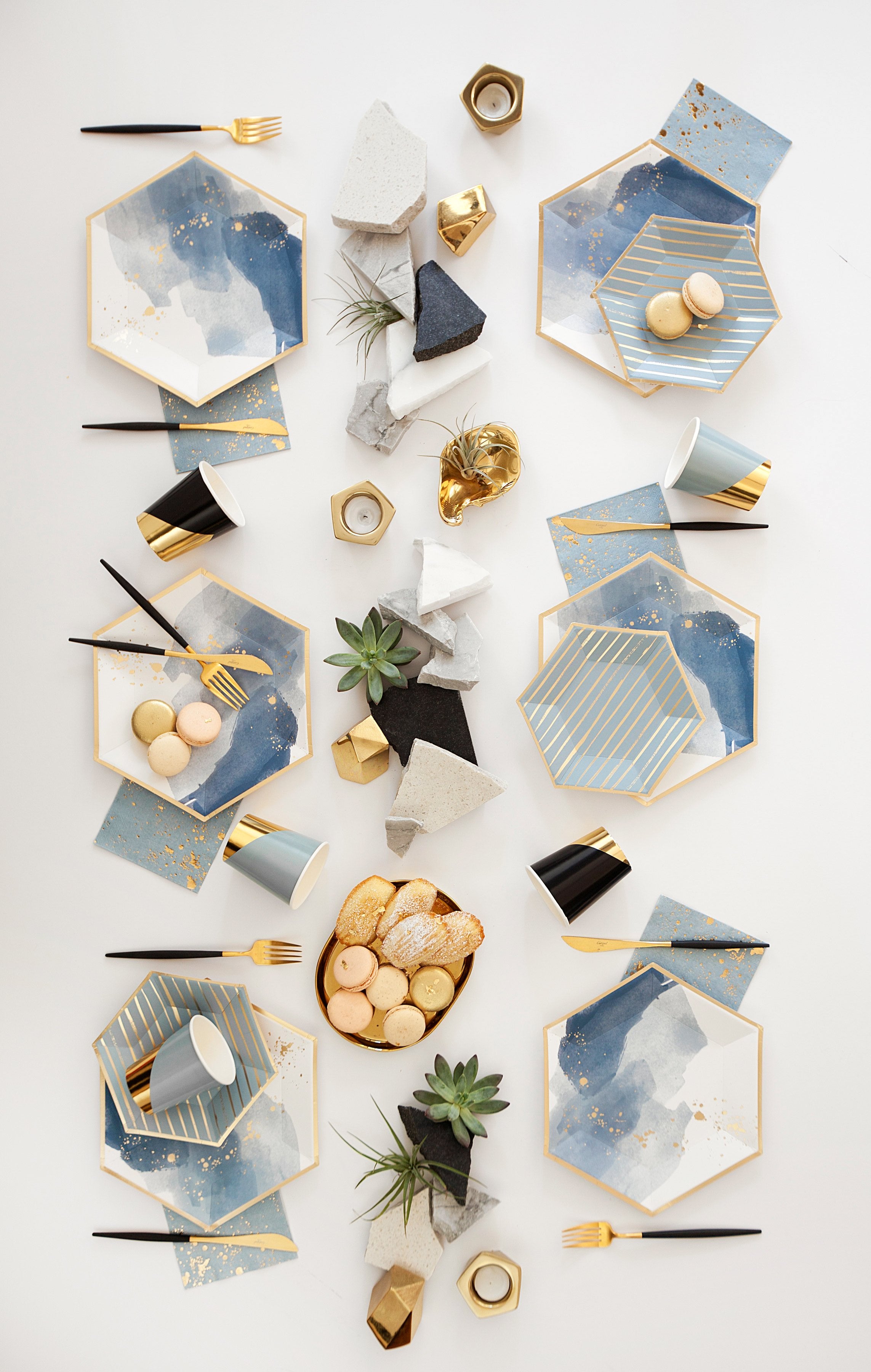 Painterly blue watercolor inspired by California waves at dusk, our large hexagon paper plate adorned with gold splashes is perfect for a relaxed gathering or an elegant celebration. Great for outdoor receptions, showers, birthdays, anniversaries, holidays and more.