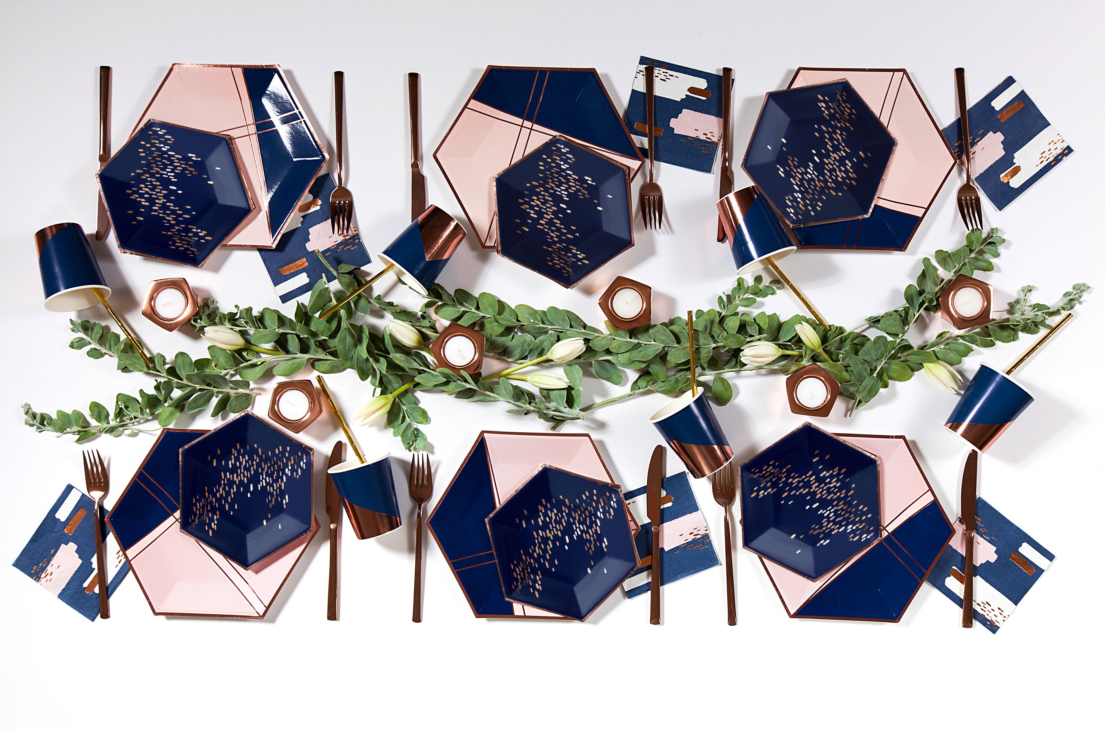 - Colors: navy, white, pale pink, rose gold foil