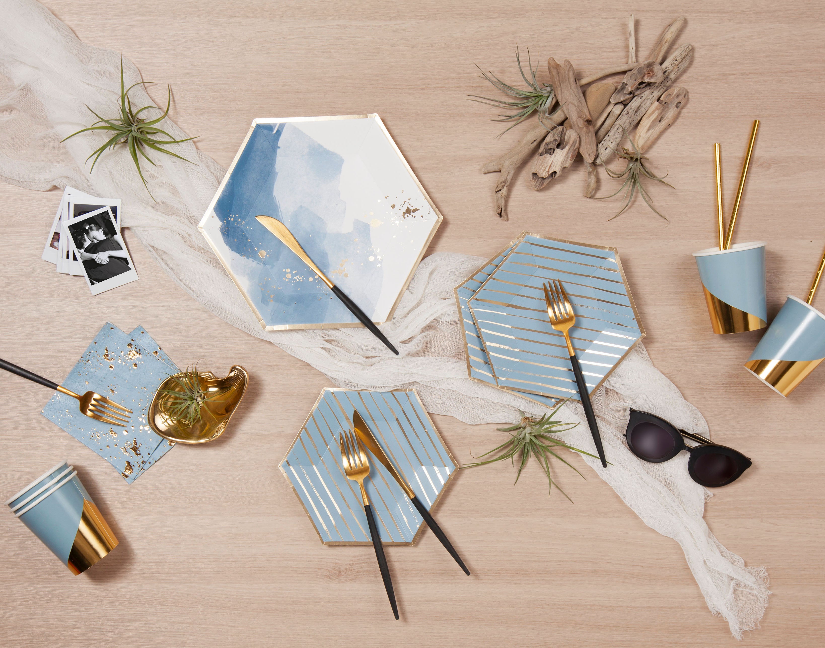 Add edge and artful detail to your tabletop with a splash of gold. Our blue lunch napkins are perfect for showers, weddings, birthdays and elegant gatherings.