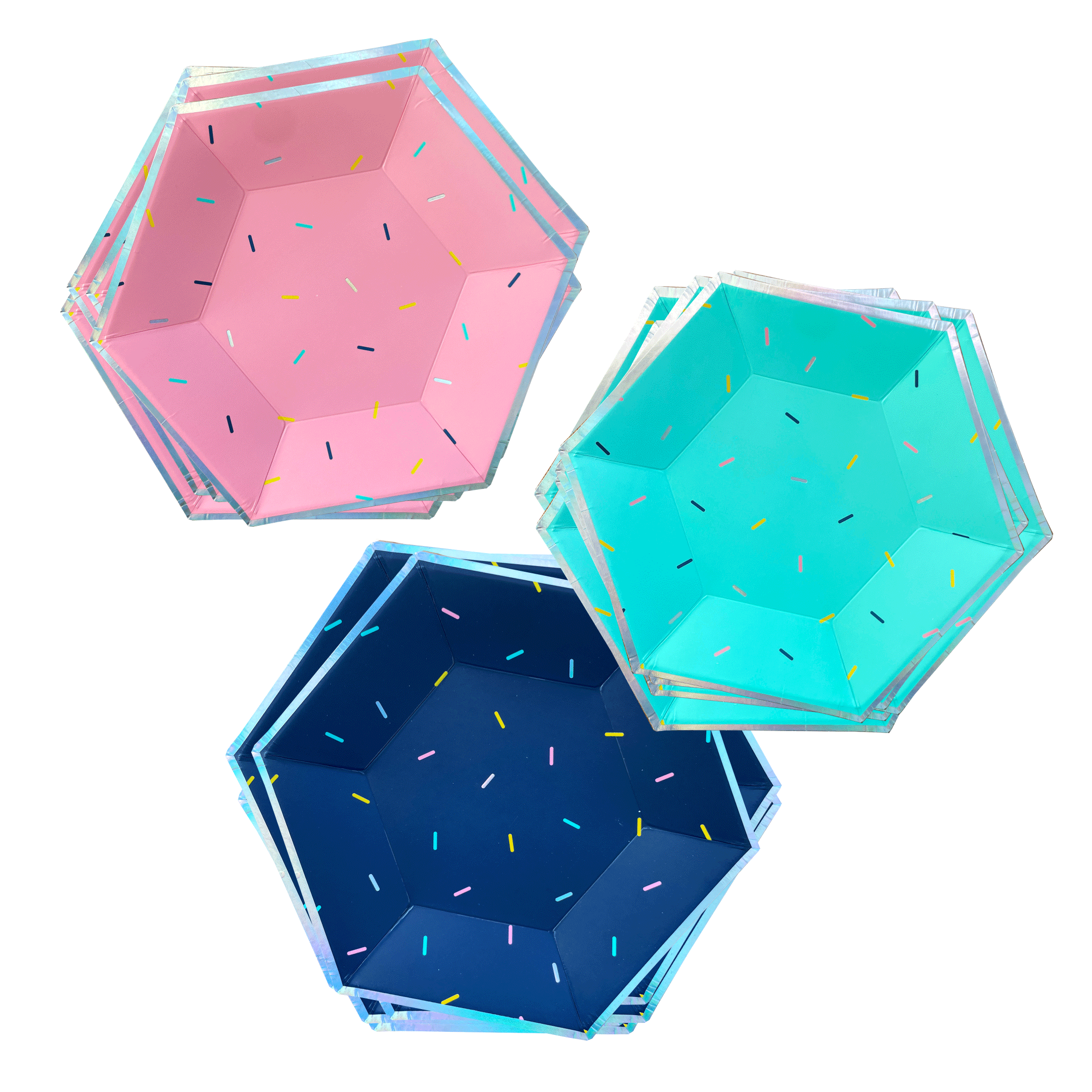 Shimmering in fun holographic rim, our bright small hexagon paper plates set a joyful tone for your next birthday celebration whether it be unicorn, ice cream, donut, or cupcake themed!