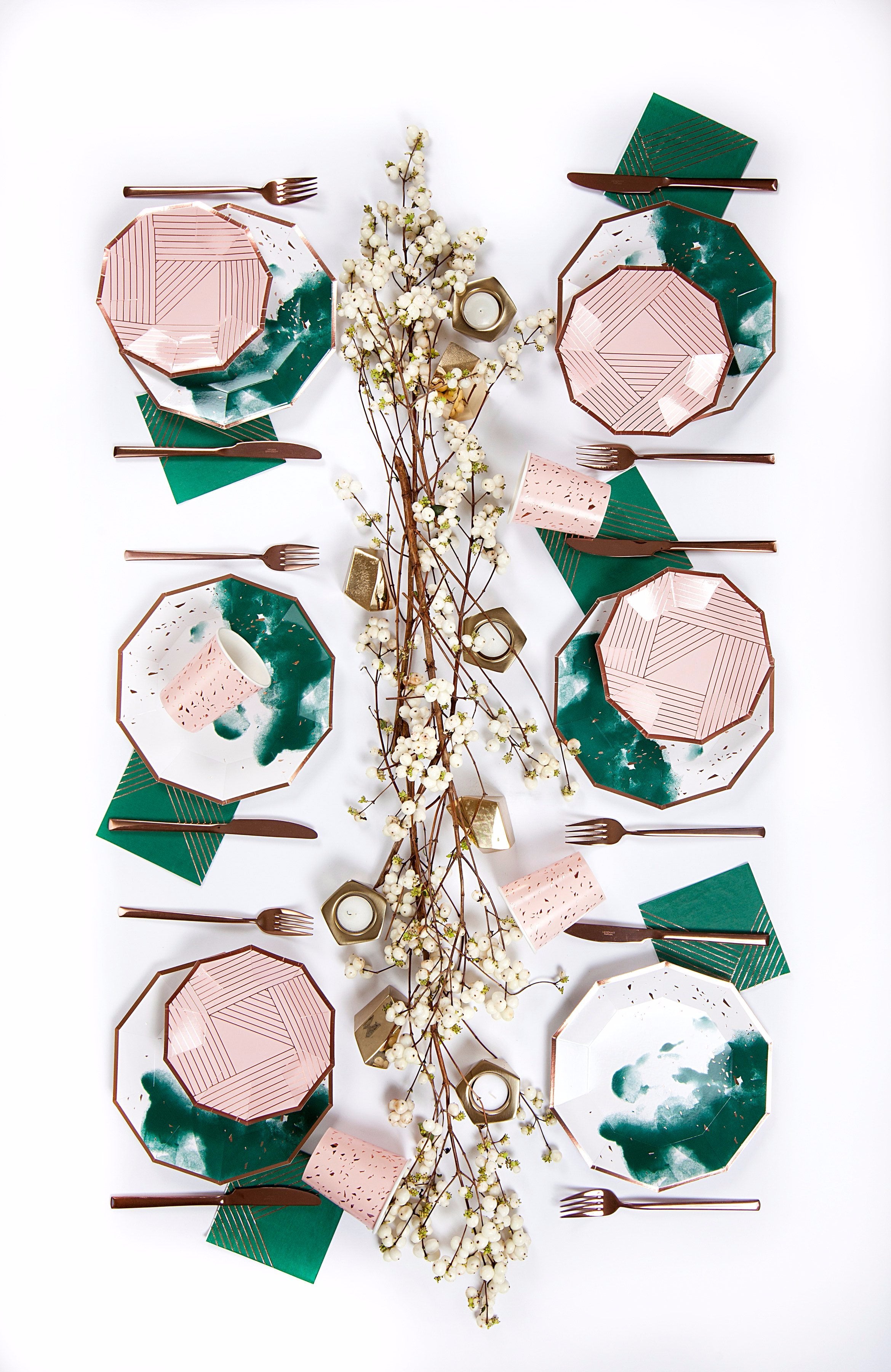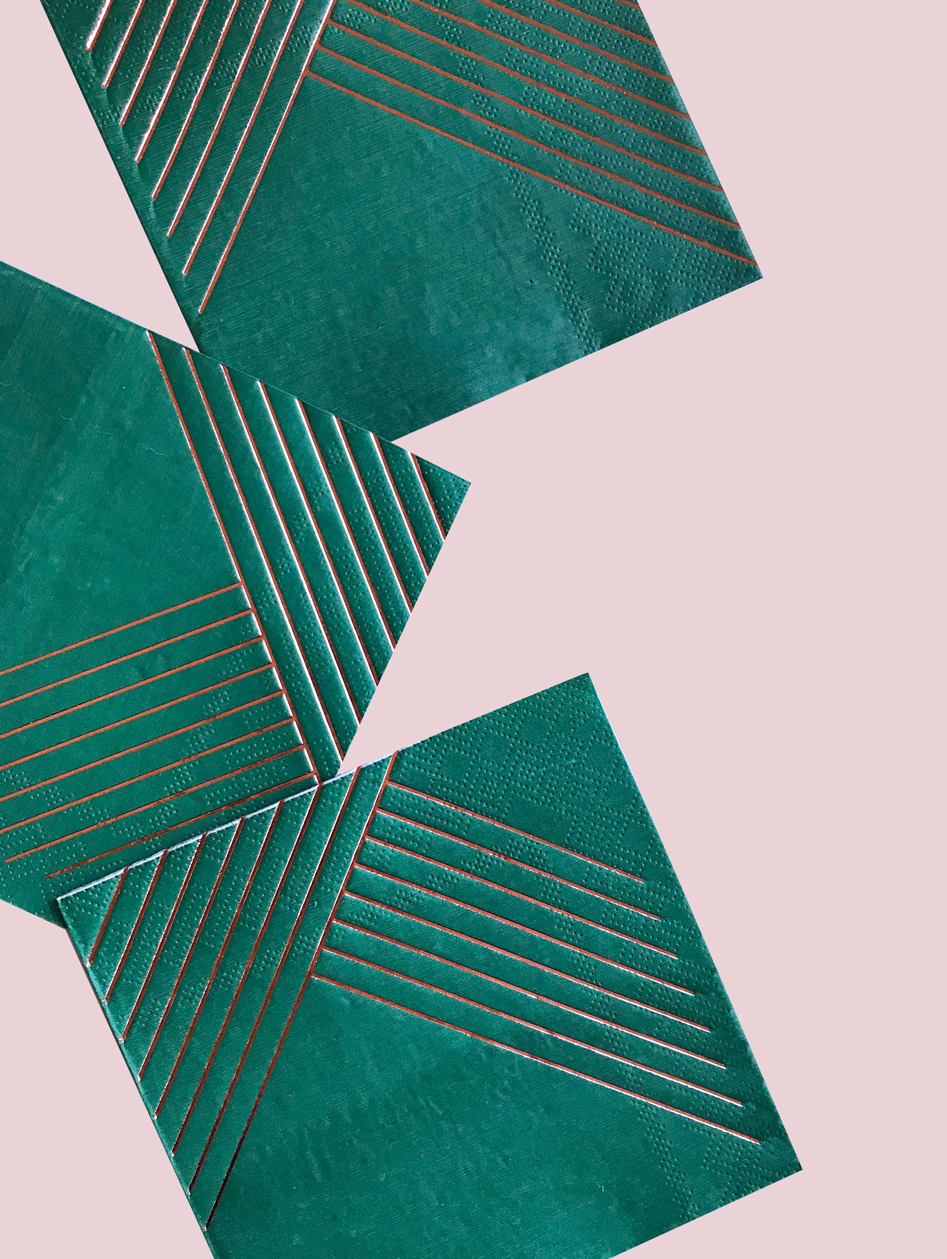 Classy green napkins inset with elegant rose gold stripes add a dash of style to your tabletop, dessert station, or bar cart.