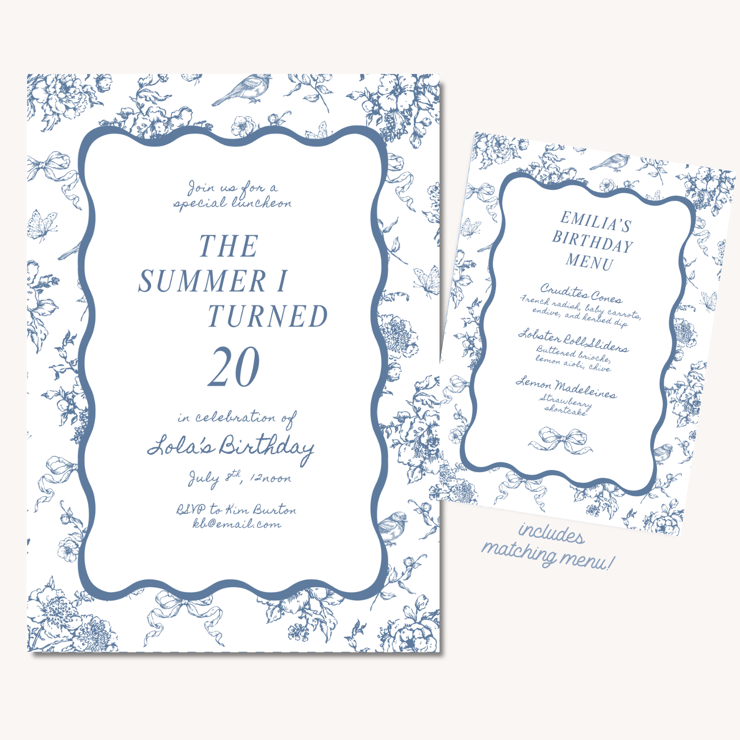 "The Summer I Turned ... " Customizable Birthday Invitation & Menu - Hamptons Toile