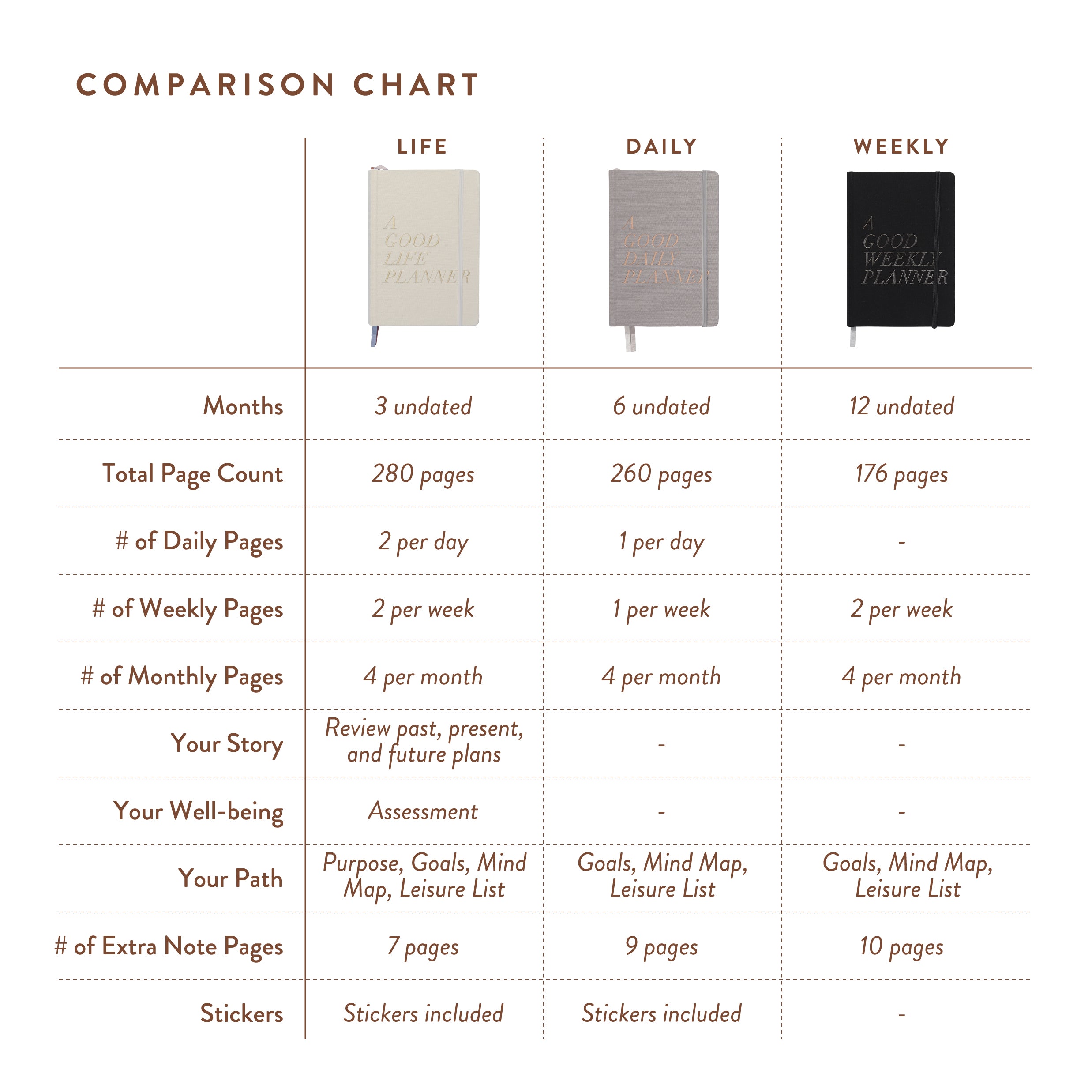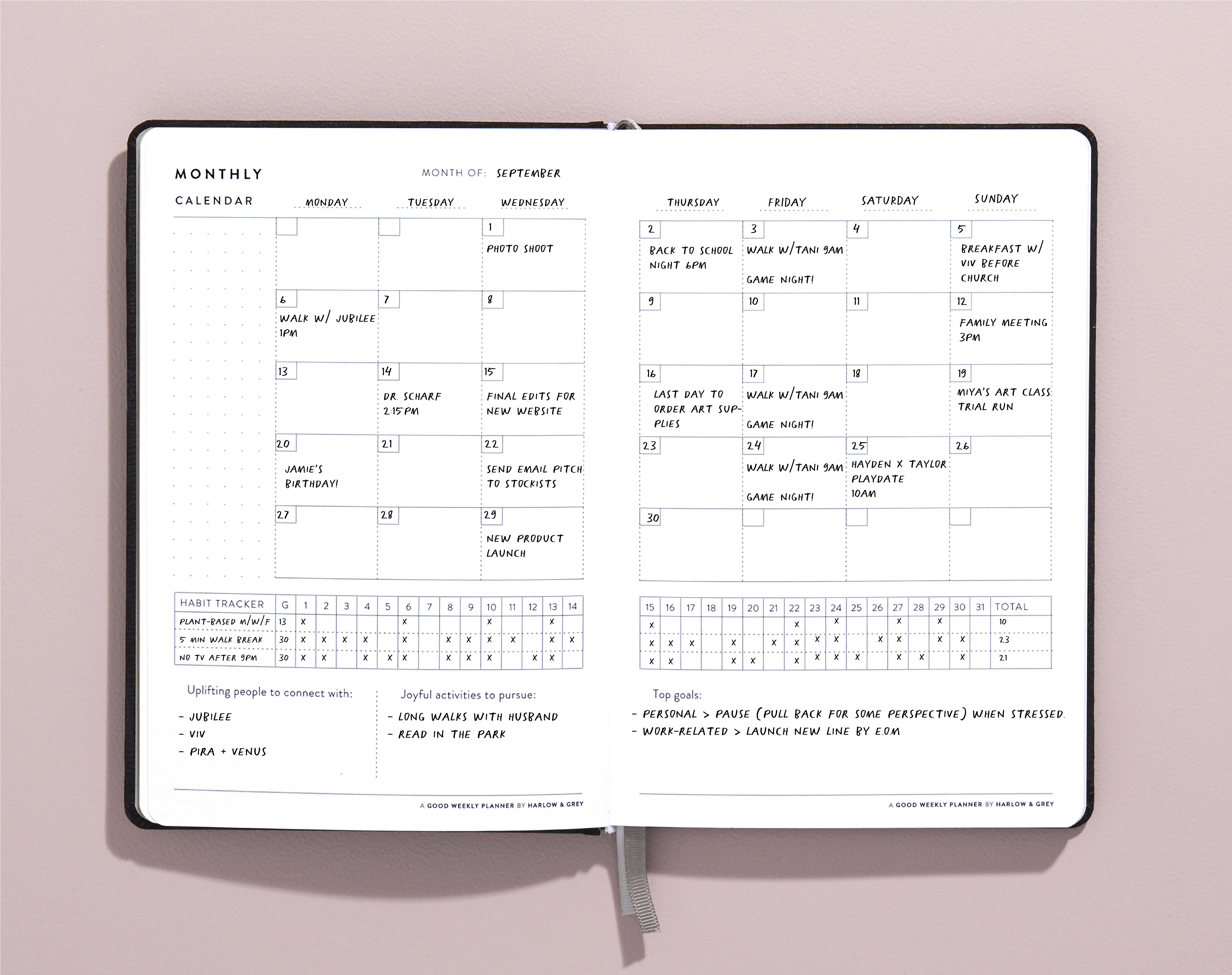 We believe that any week that is meaningful is a good one. We created "The Good Weekly Planner" to help you organize and manage your weeks and pause every month to reflect. The more you engage in these journaling practices, the more you will recognize patterns and better understand your thoughts and behavior. You will move forward with intention and a stronger sense of purpose.