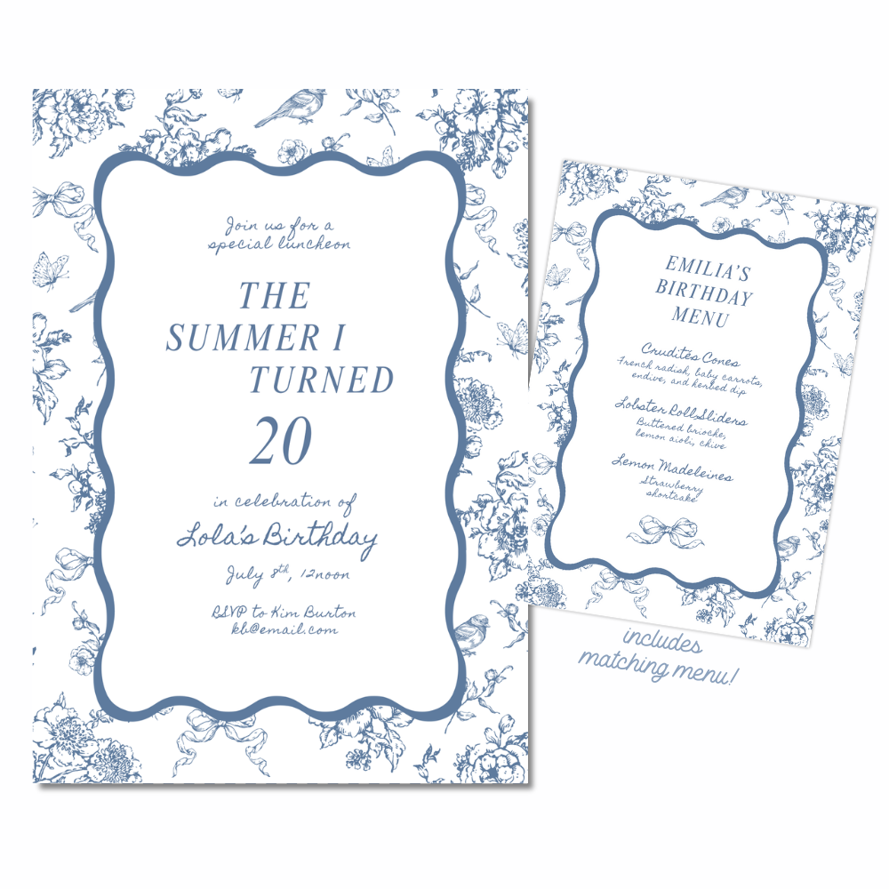 "The Summer I Turned ... " Customizable Birthday Invitation & Menu - Hamptons Toile
