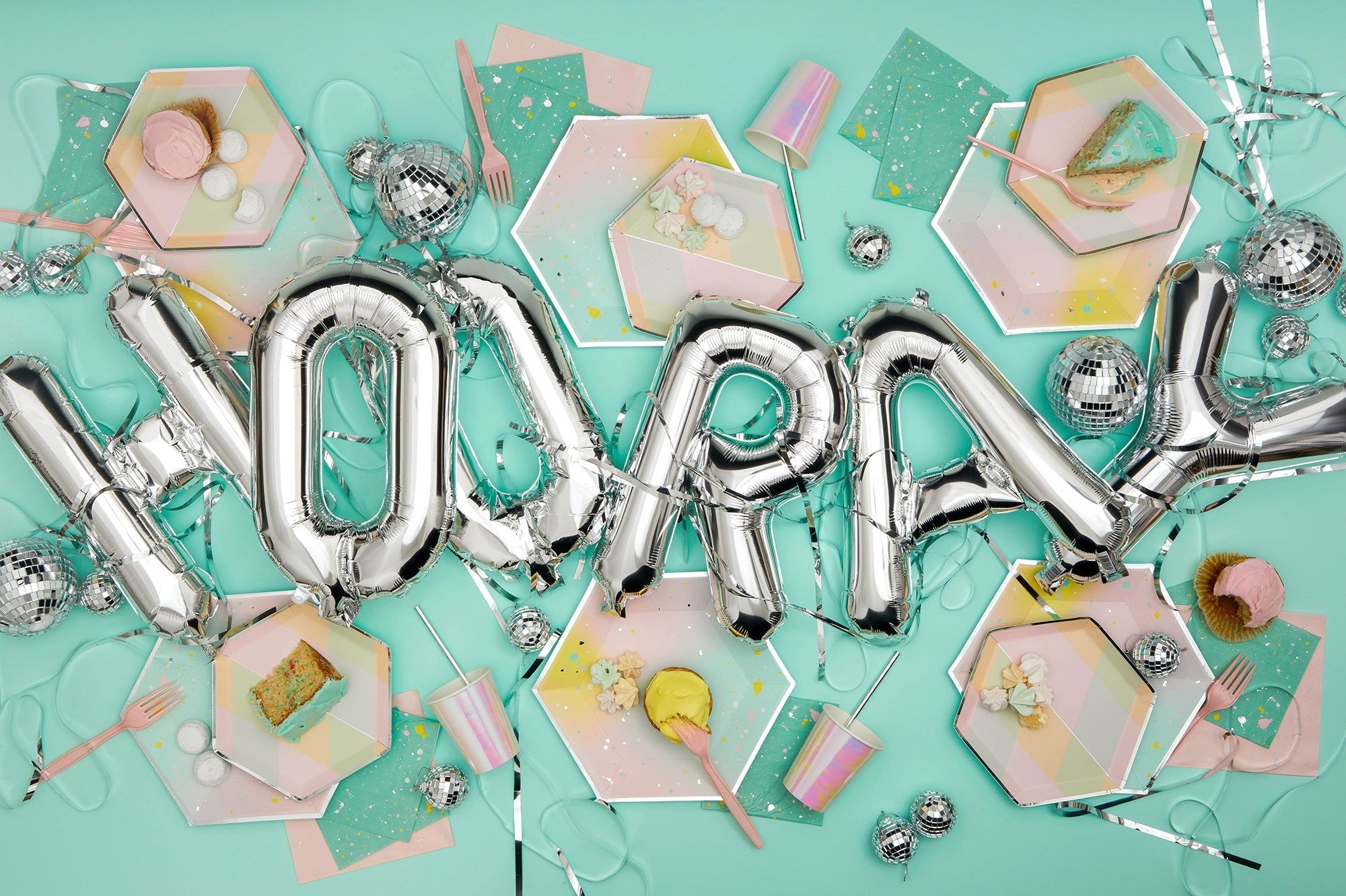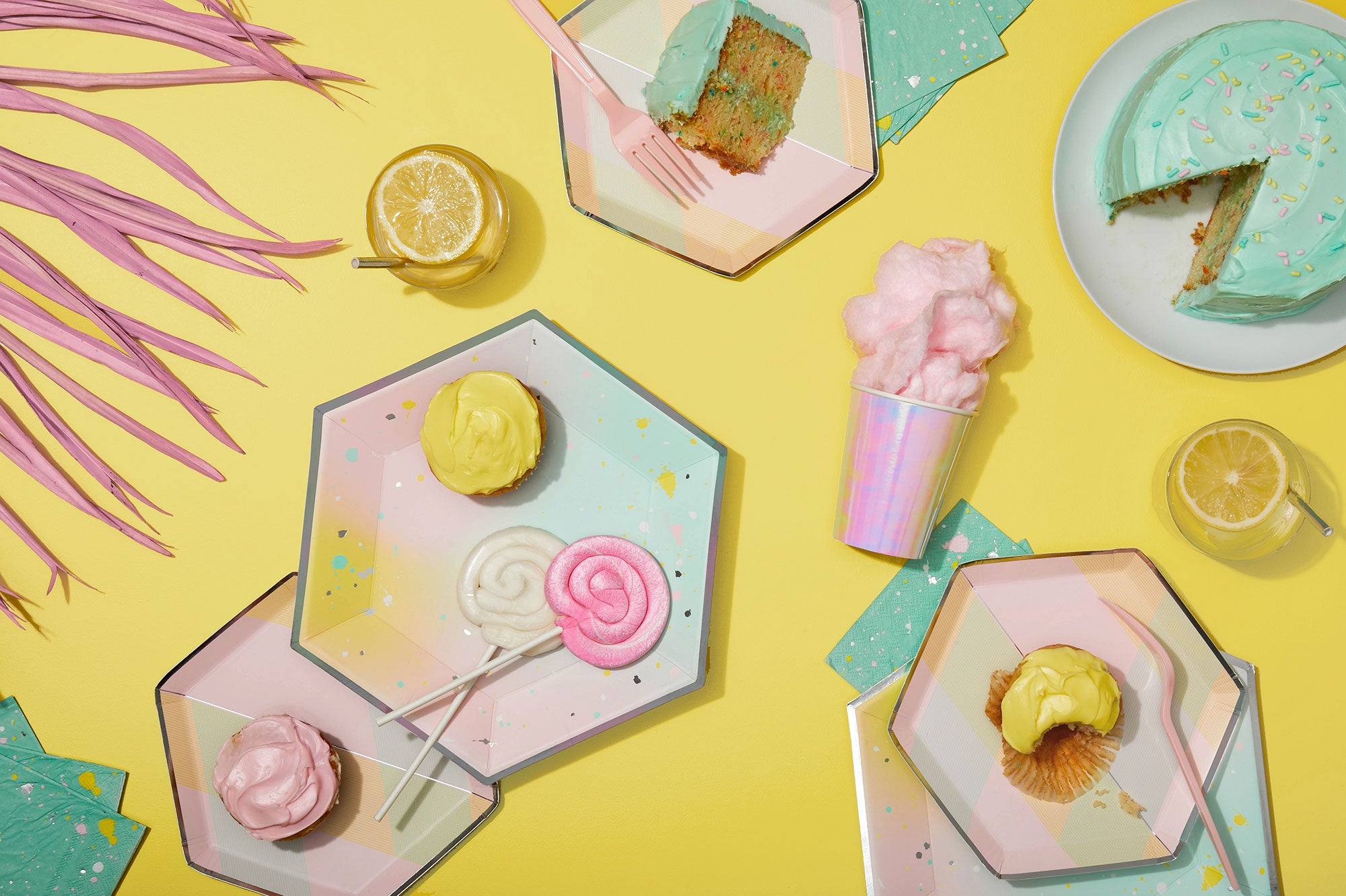 Celebrate your next birthday or social event with our Pastel ombre large paper plates! Shimmered with silver splatters and fun colors, wow your guests with an 80's themed party or aura-reading party at the park!