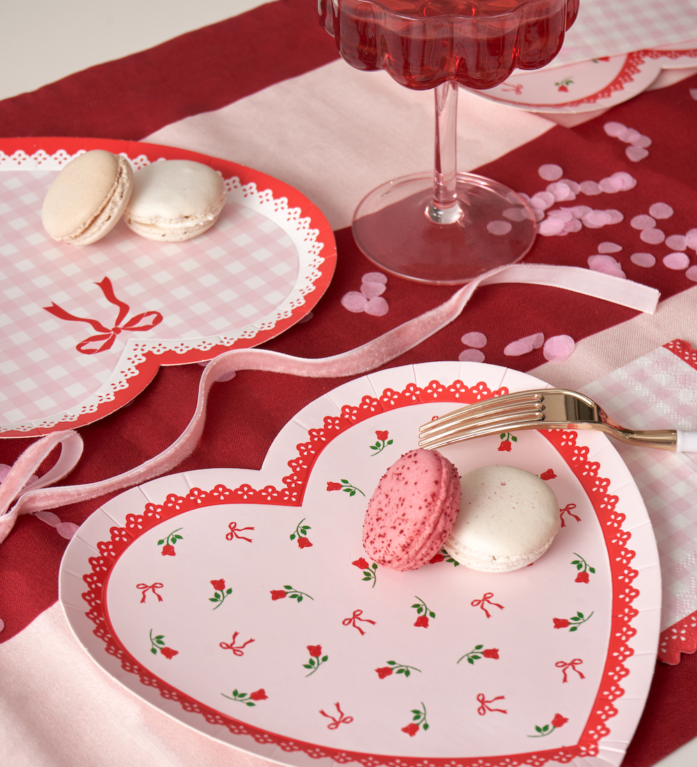 Inspired by a romantic and playful coquette aesthetic, these plates feature a delightful mix of pale pink, red, and white tones with dainty florals, gingham, bows, and lace detailing.