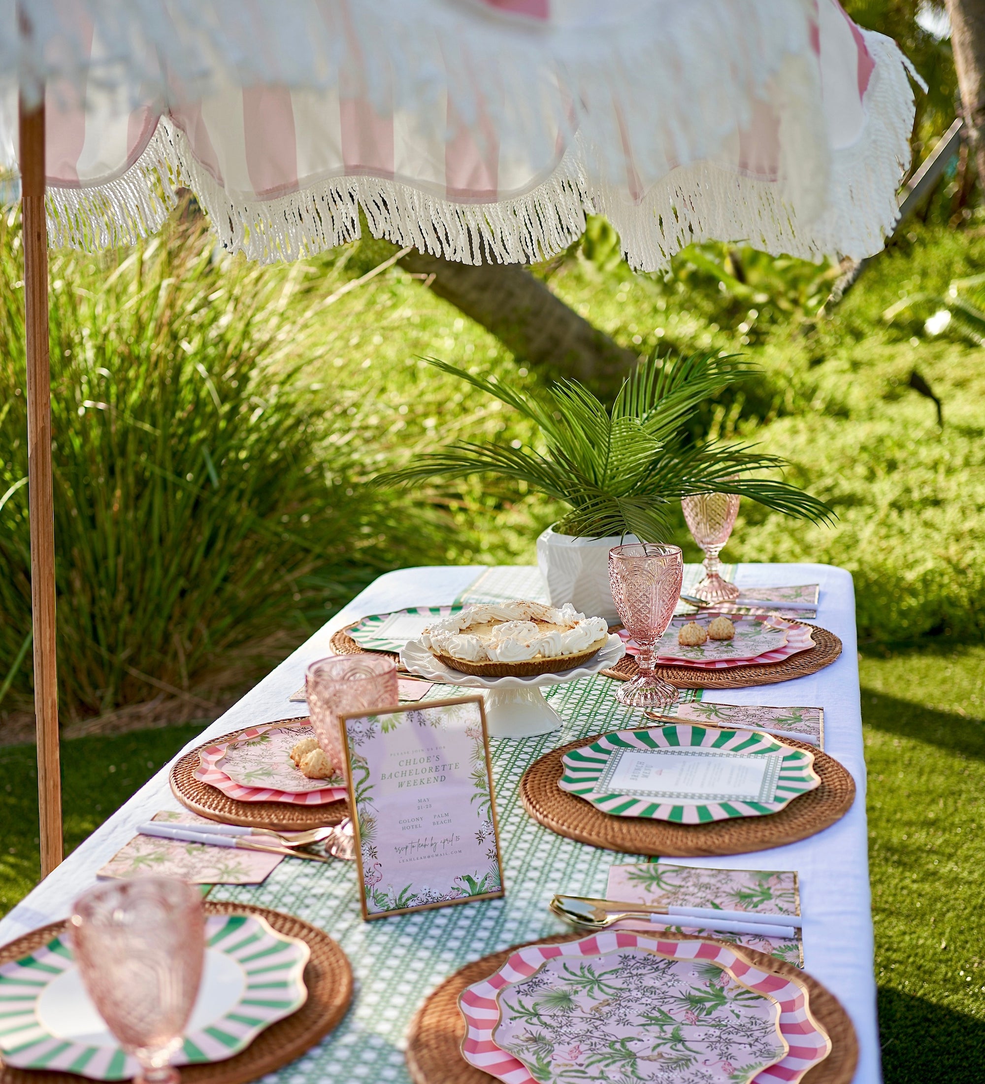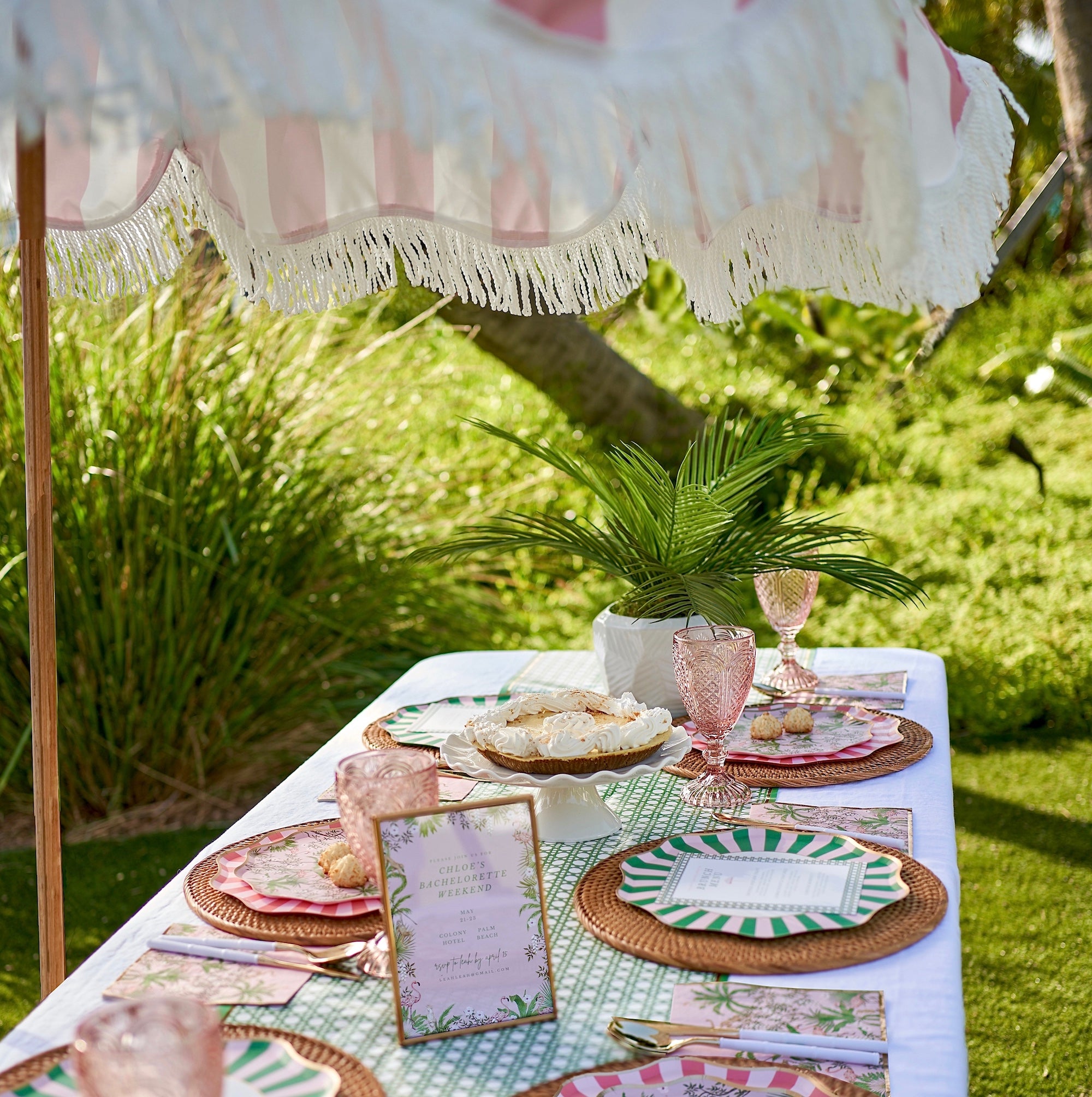 Harlow & Grey's Palm Beach Collection is inspired by the iconic charm of Palm Beach chic - think lush palm fronds, cabana stripes, and a playful palette of bright pinks and vibrant greens. This collection is a quintessential blend of tropical luxury and relaxed coastal sophistication, perfect for poolside brunches, elevated dinner parties, bridal showers, and summer soirées.
