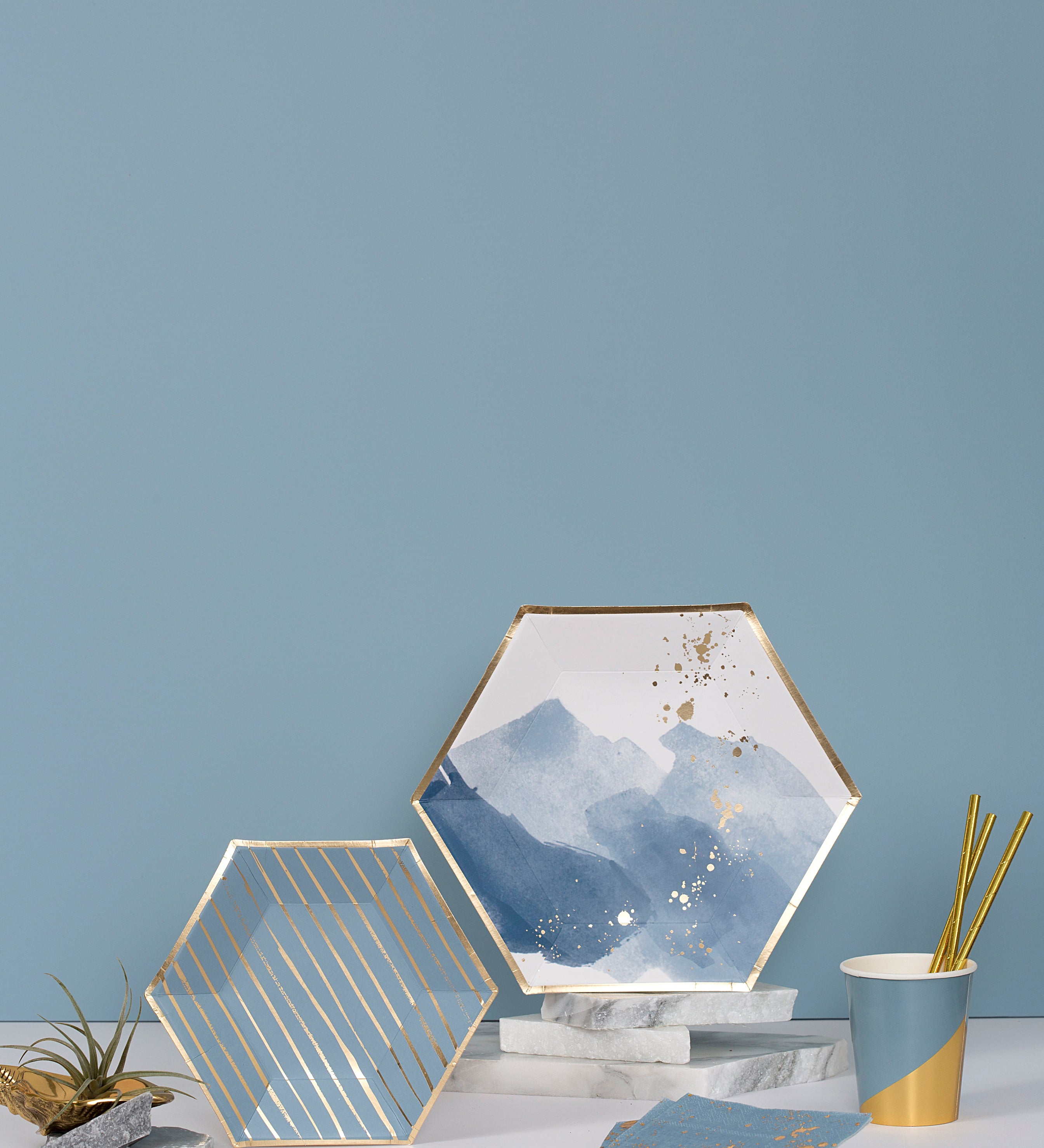 Inspired by blue California waves at dusk, our Malibu Collection features soft washes of watercolor with splashes of gleaming gold.