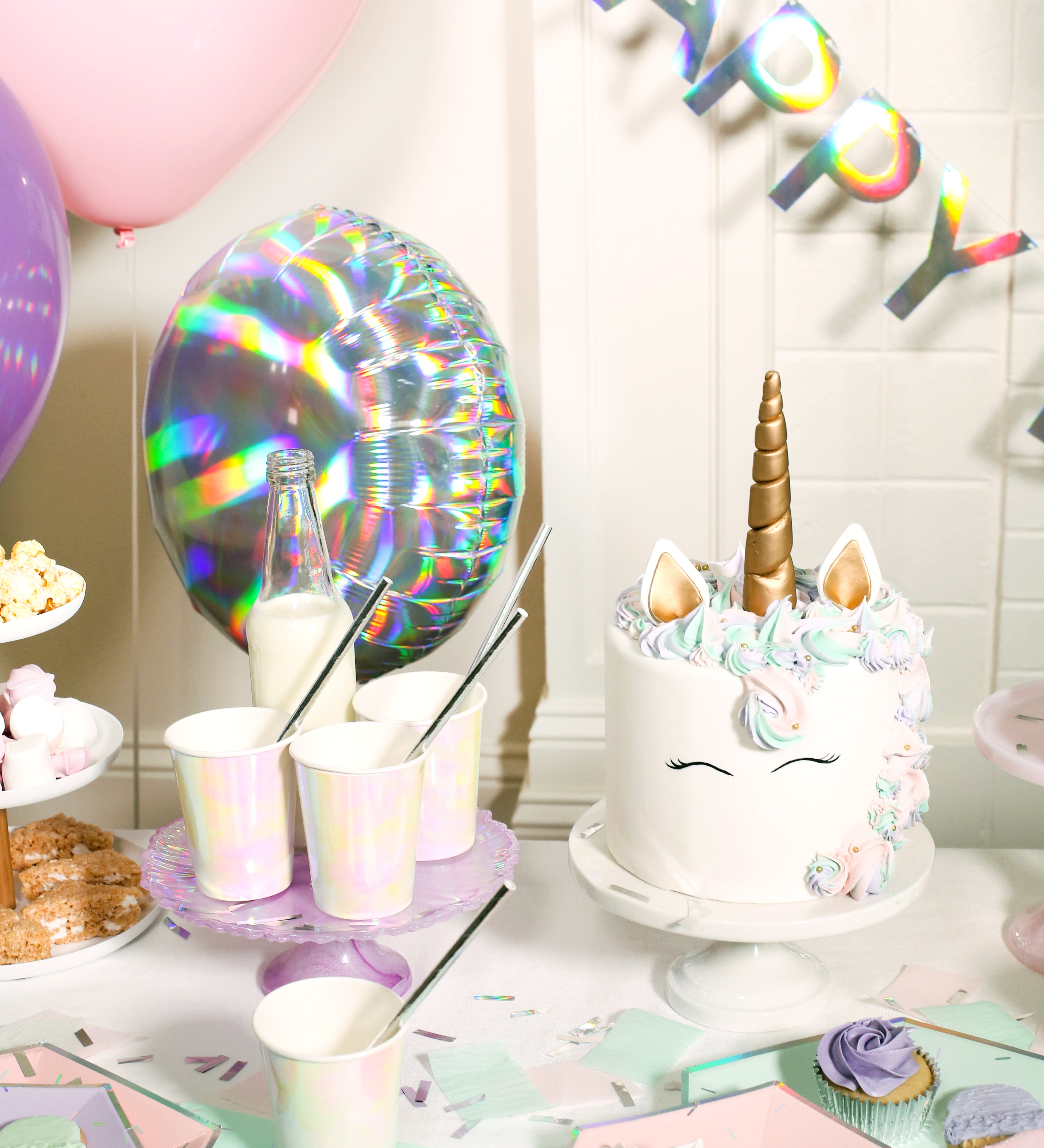 Make your unicorn birthday party dream come true! Designed with shiny iridescent holographic foil details, our pretty pastel tableware kit will have every kid and adult feeling sprinkled with love!
