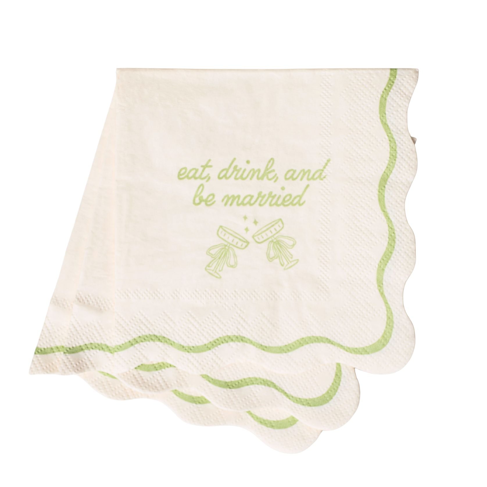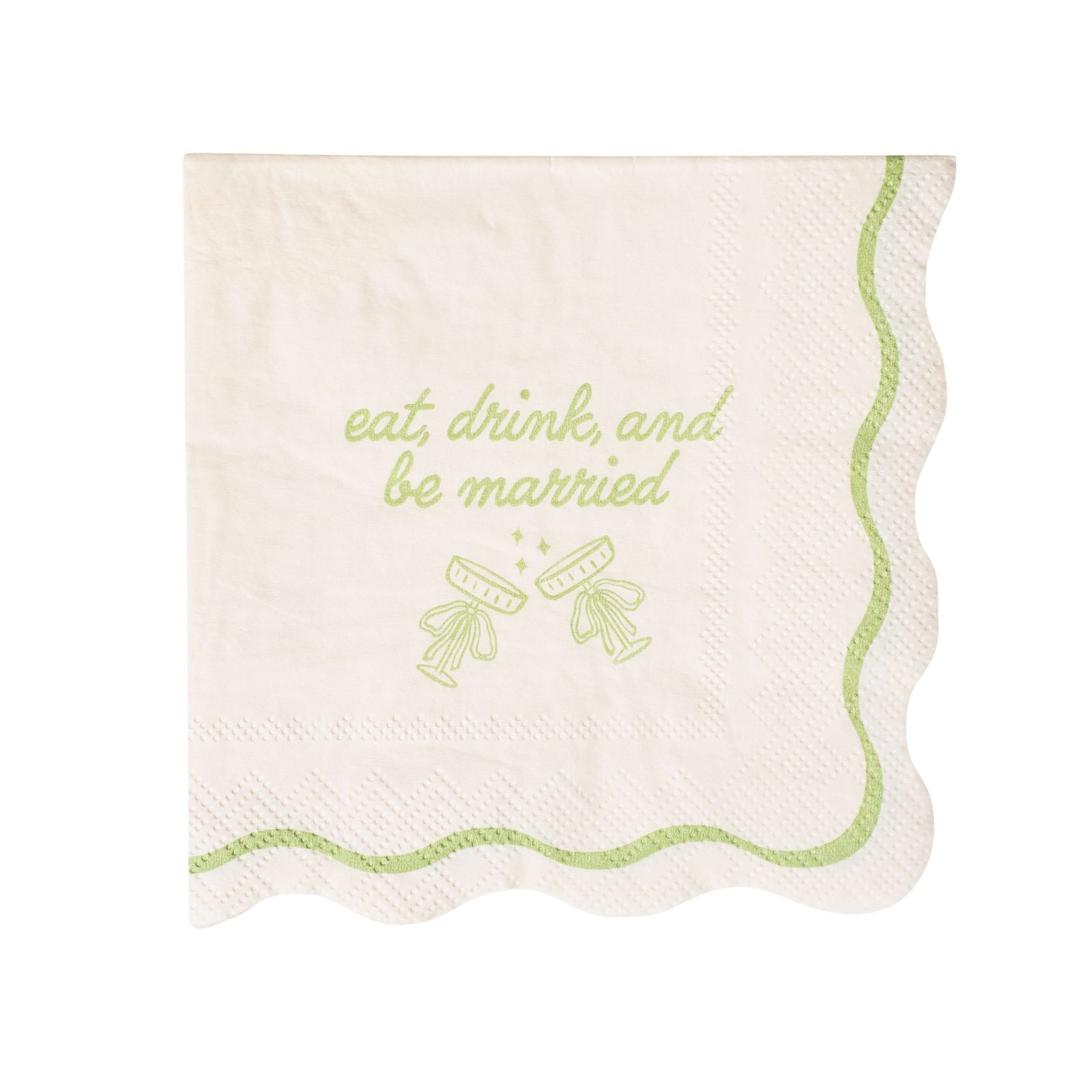A toast to love, laughter, and happily ever after! Our Eat, Drink, & Be Married cocktail napkins are the sweetest finishing touch for bridal showers, rehearsal dinners, wedding receptions, or elopement celebrations. With a cream base, soft green duotone trim, scalloped edges, and two clinking champagne coupes tied with bows, they’re playful, chic, and full of charm.